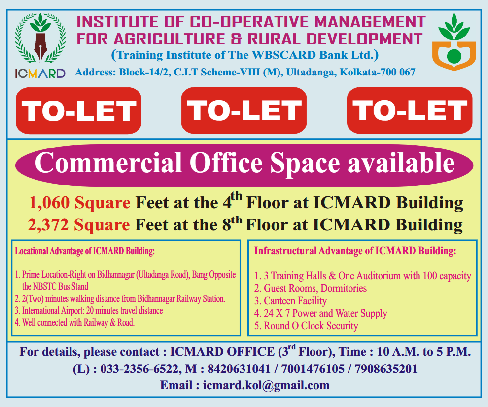 The Institute of Co-operative Management for Agriculture & Rural Development (ICMARD) is an apex training institute in cooperative sector of West Bengal working under the parent organisation of The WBSCARD Bank Ltd. Since its inception in 1997, ICMARD has curved a niche in the cooperative sector with its all-round performance in training and capacity building programmes. The institute has been accredited by the Centre of Professional Excellence in Cooperatives (C-PEC), the training wing of Bankers Institute of Rural Development (BIRD), Lucknow (An autonomous Society promoted by NABARD).